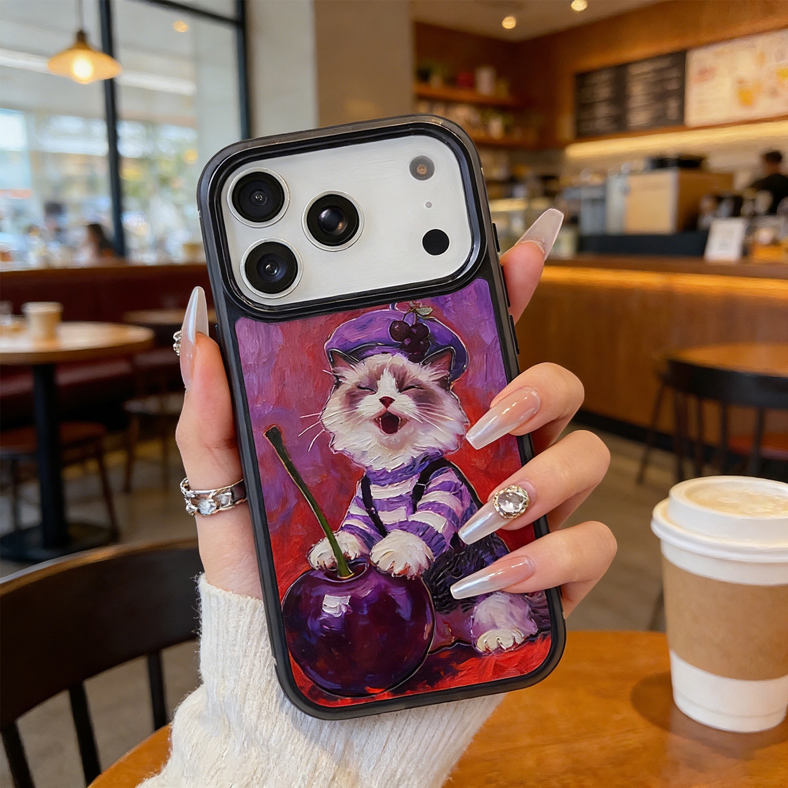 Cute Cherry Cat Phone Case for iPhone 17 Pro Max - Vintage Oil Painting Art Print Design, Purple