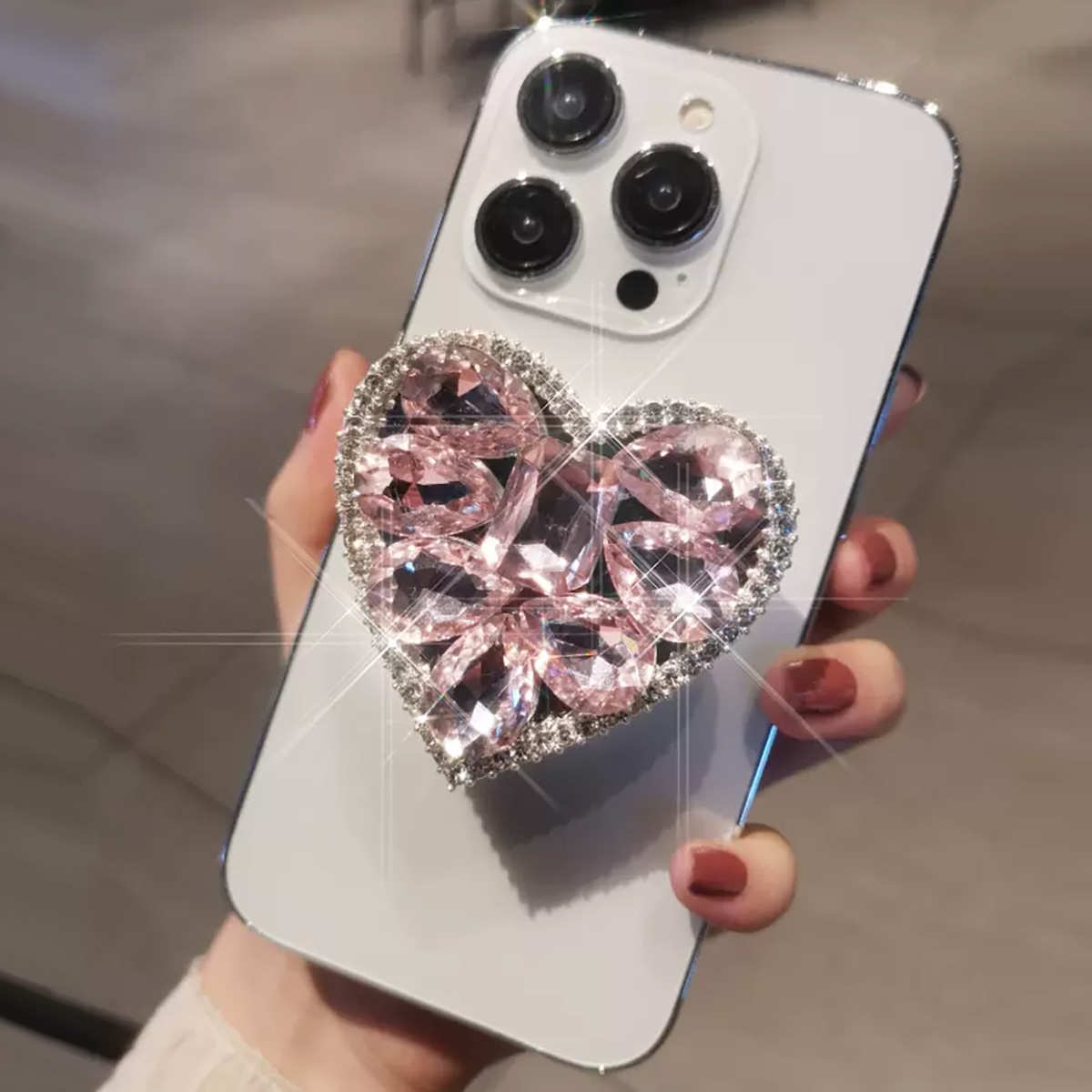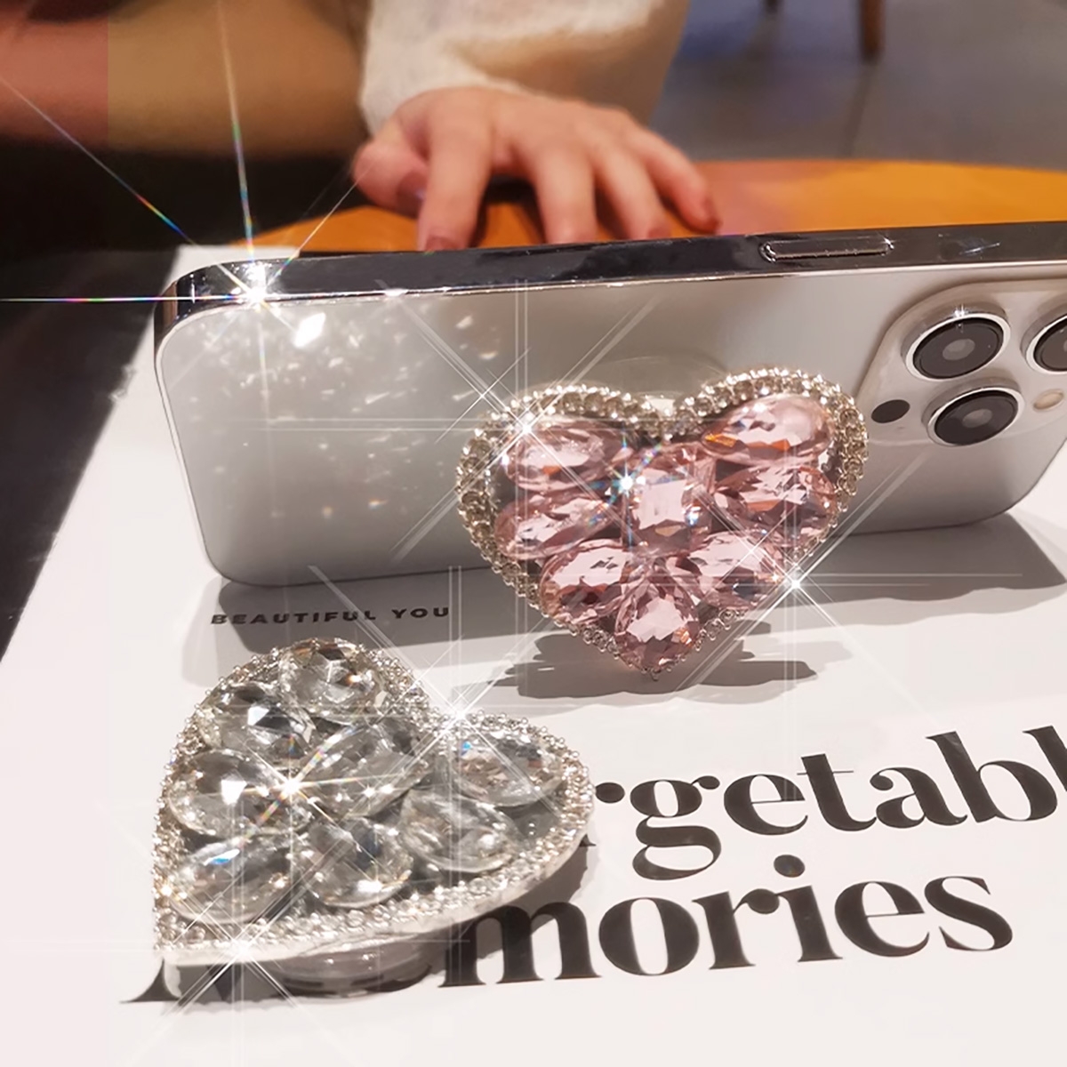 Secure Hold and Stand: Offers a reliable grip for single-hand texting, photo taking, and video viewing. Functions as a sturdy kickstand when unfolded.Foldable and Lightweight: The compact structure folds flat, allowing easy storage in pockets or bags while remaining attached to the phone.Decorative Heart Shape Design: Features a heart-shaped surface with a diamond-like appearance, adding a unique decorative element to your device.Magnetic and Adhesive Support: Includes a strong double-sided adhesive pad for attachment to flat surfaces. Compatible with magnetic phone mounts and cases.Material Compatibility: Adheres to most phone surfaces and cases. Repositionable adhesive leaves no residue upon removal.