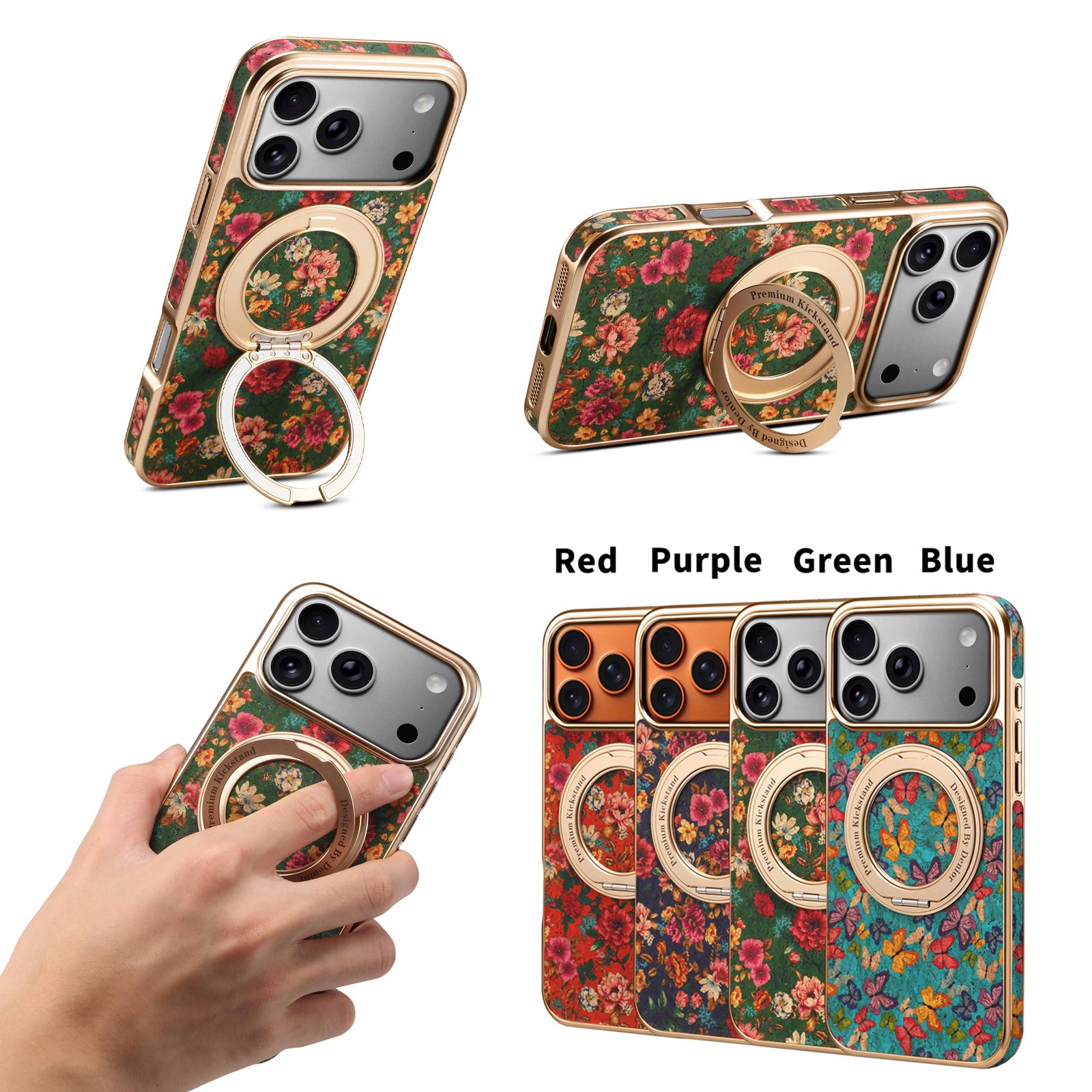 Denior Floral Print Magnetic Gear Rotating Stand Phone Case for iPhone 17 Pro Max | Eco-Friendly Cork | Fingerprint-Resistant Electroplated Case - Peony Green
