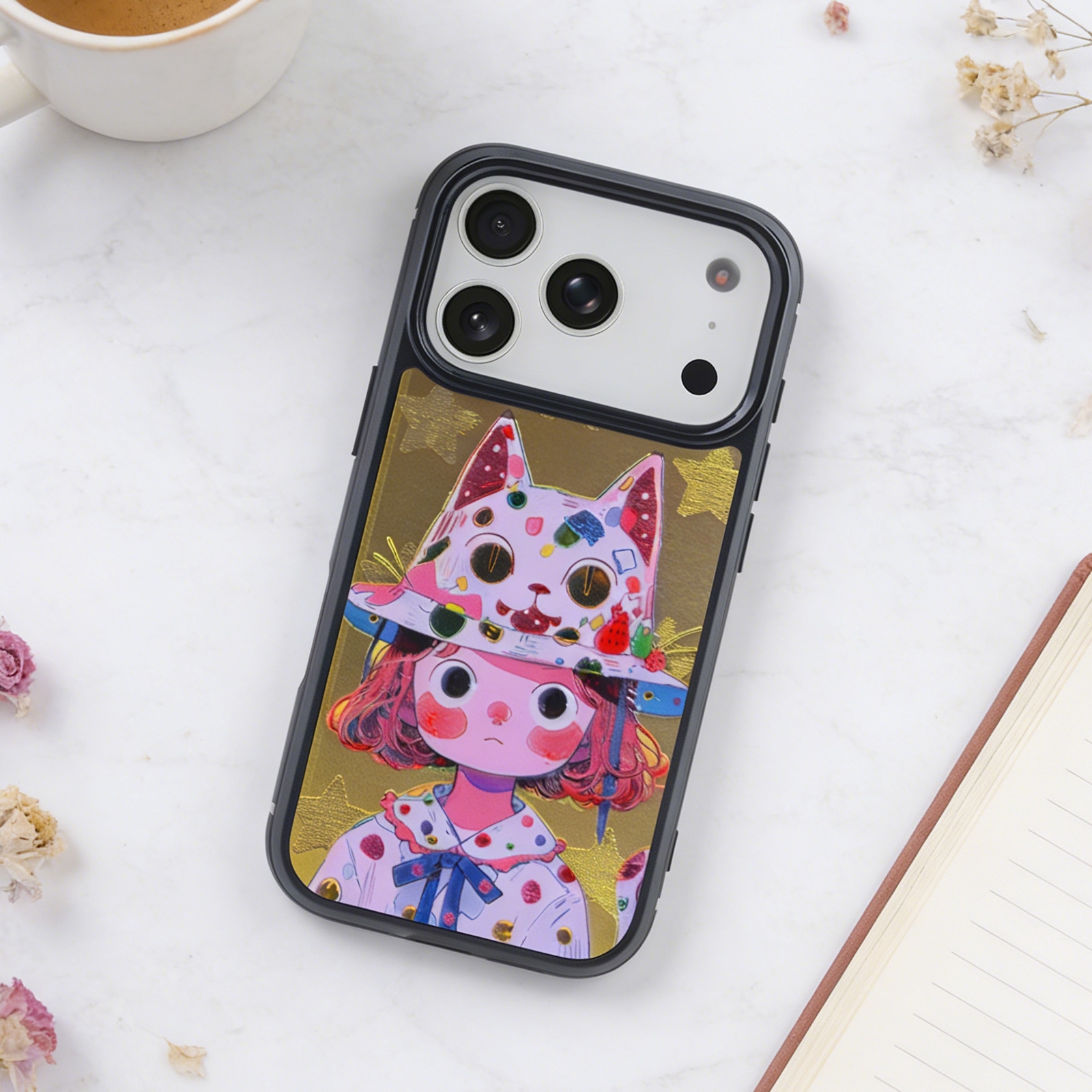 Girl with Cat Hat Phone Case for iPhone 17 Pro Max - Whimsical Art Print Protective Cover, Yellow