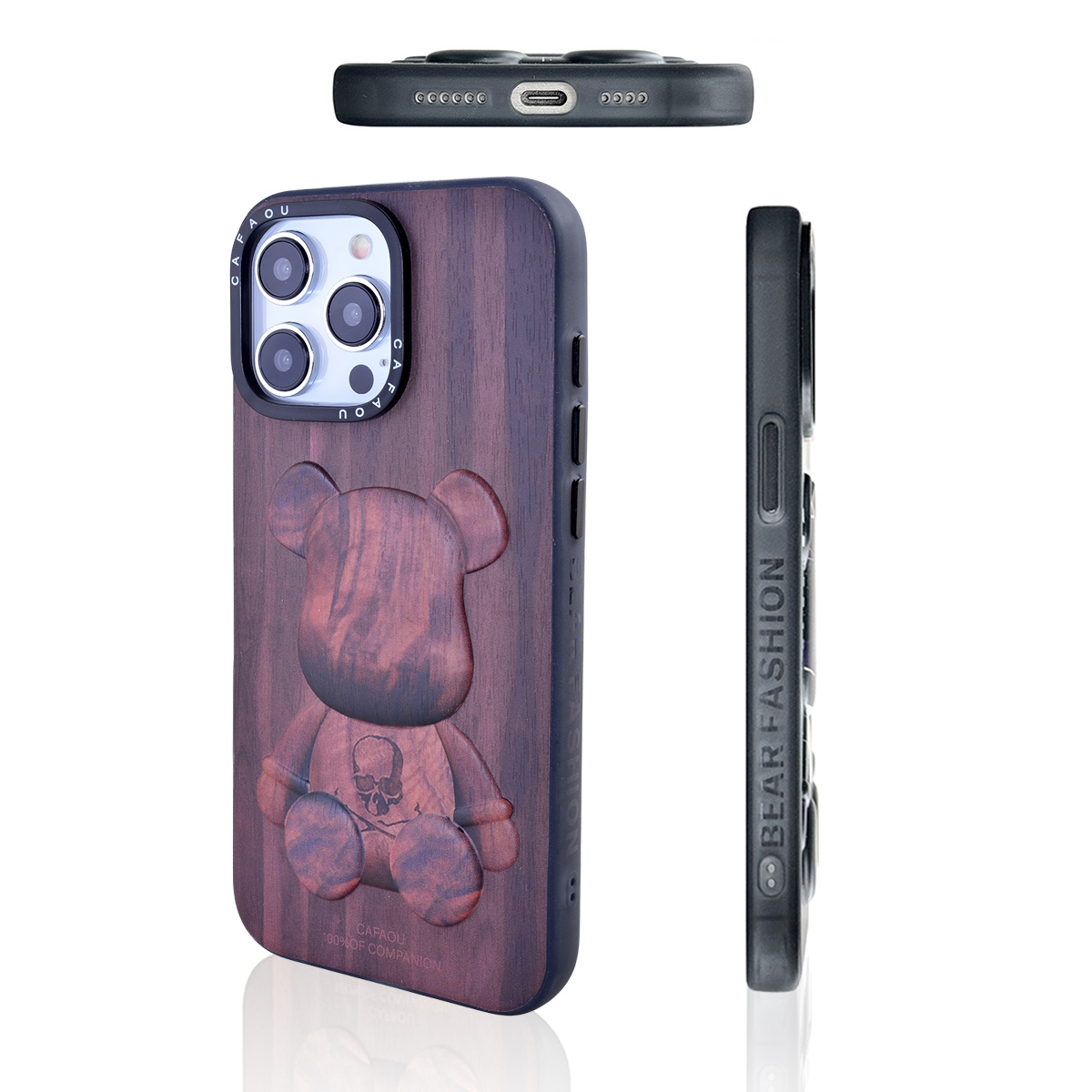 iPhone 16 Pro Max Bear Case, Wood Grain Engraved TPU + PC Cover