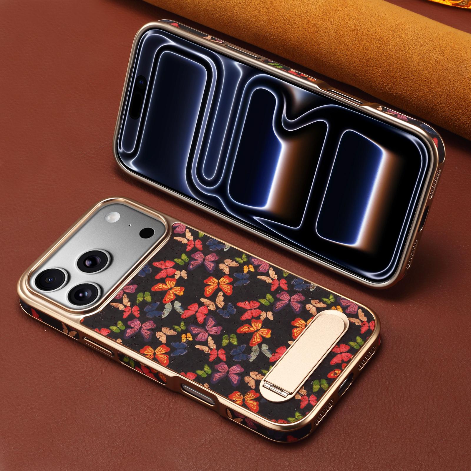 All pictures shown are for illustration purpose only. Actual product may vary due to product enhancement.Denior Butterfly Print Kickstand Phone Case for iPhone 17 | Cork Material | Wireless Charging Supported - Butterfly Black
