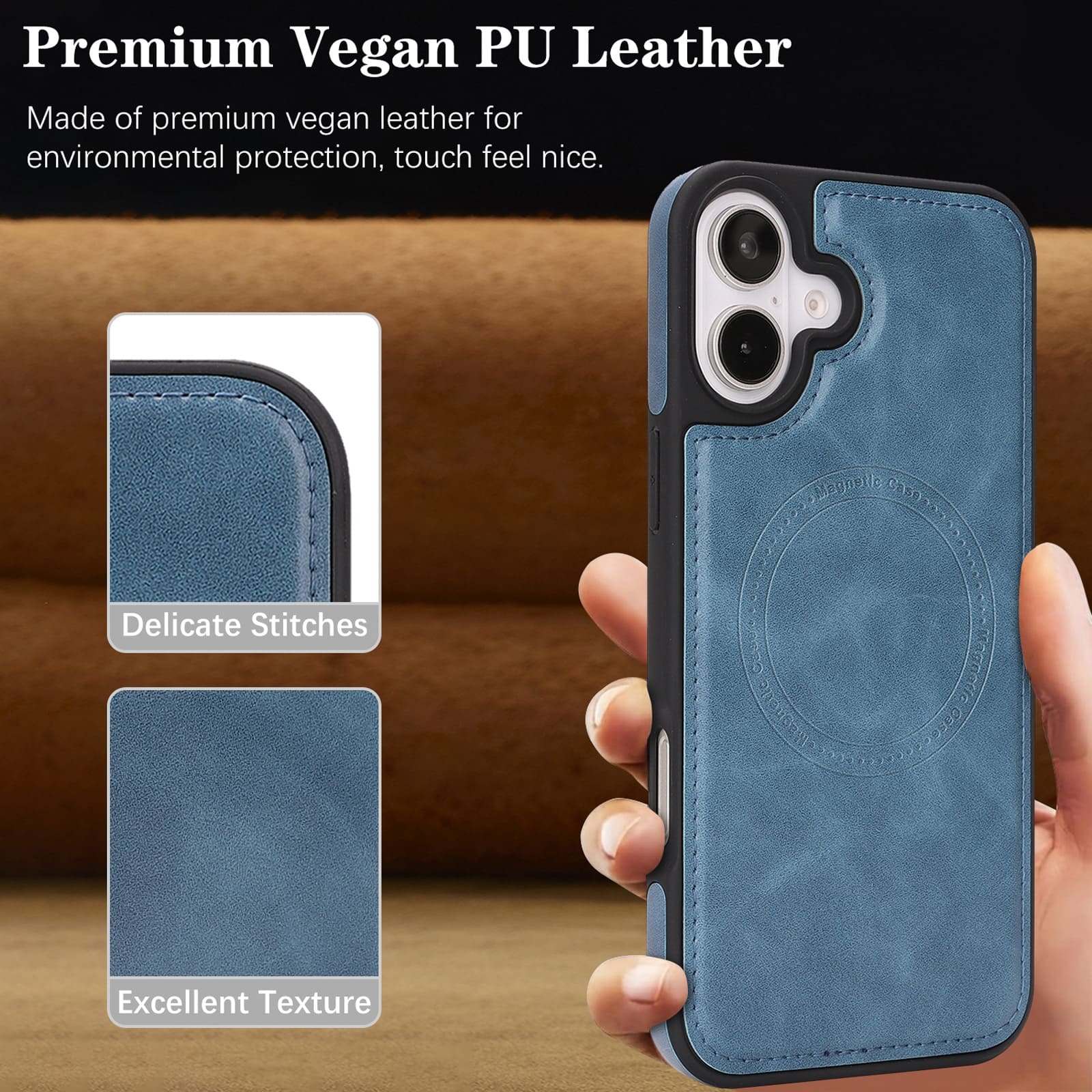 iPhone 17 Magnetic Case – Vegan Leather Shockproof MagSafe Cover Blue