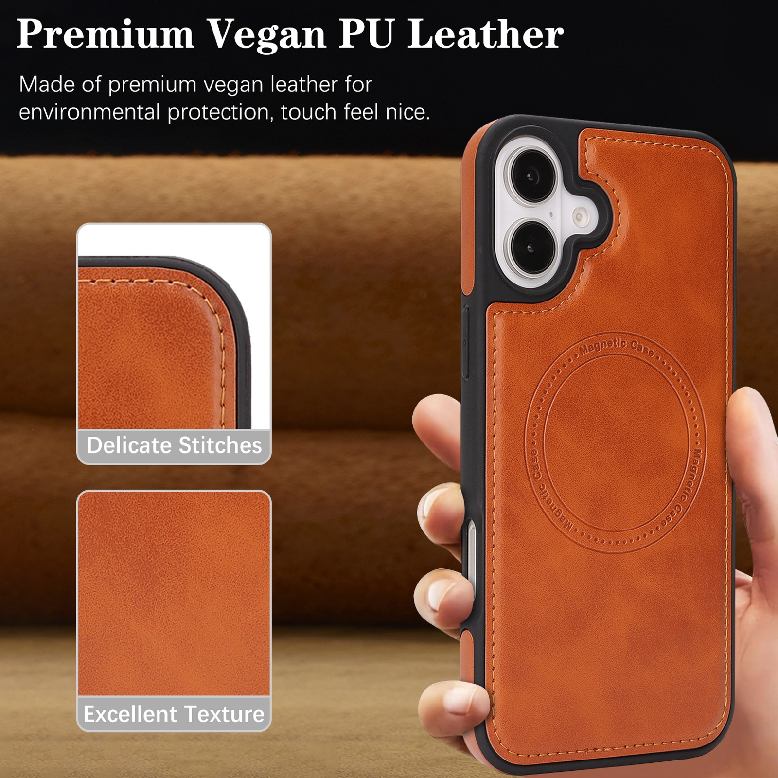 iPhone 17 Magnetic Case – Vegan Leather Shockproof MagSafe Cover Light Brown