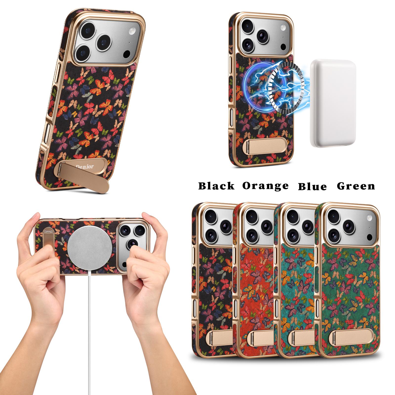 All pictures shown are for illustration purpose only. Actual product may vary due to product enhancement.Denior Butterfly Print Kickstand Phone Case for iPhone 17 Pro | Cork Material | Wireless Charging Supported - Butterfly Black