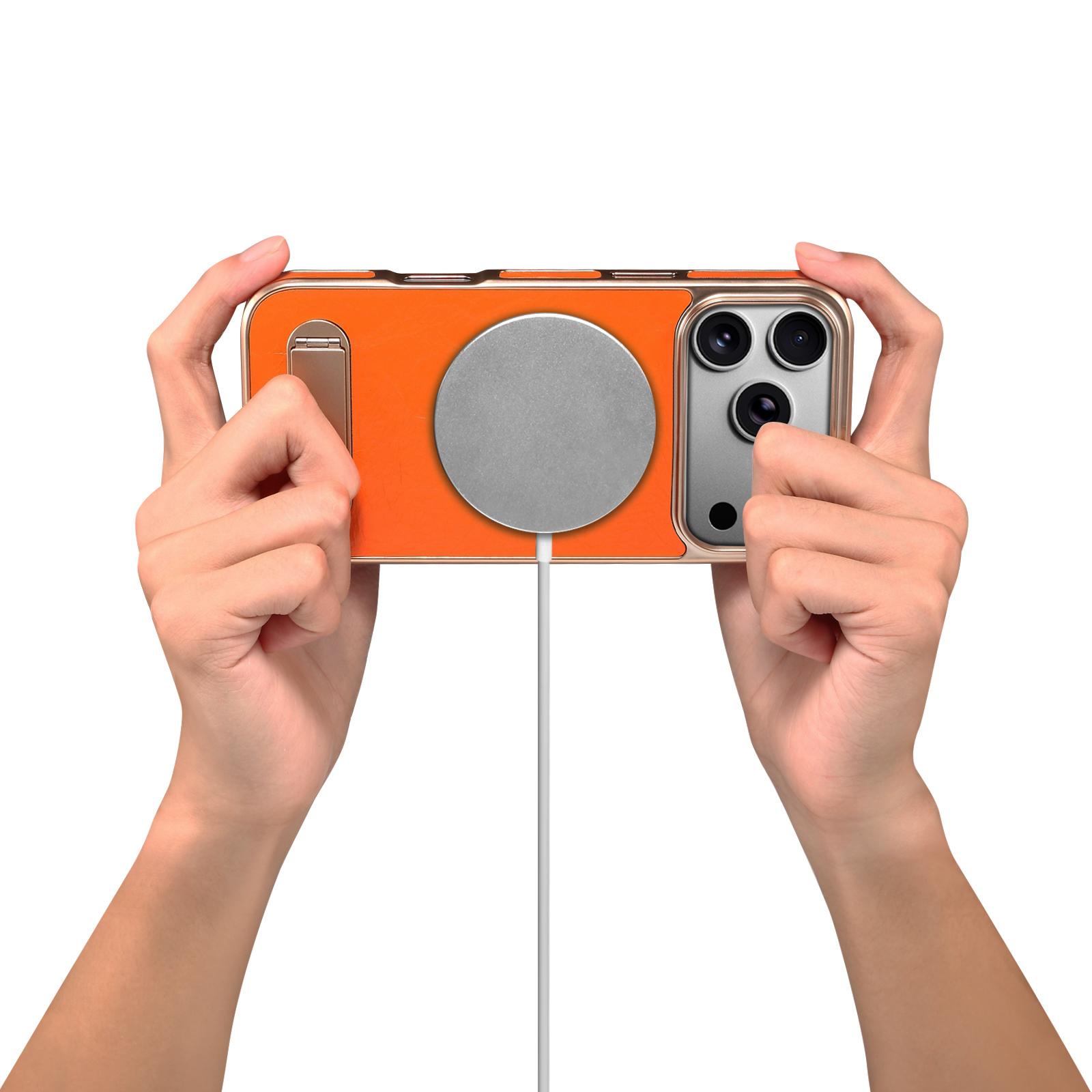 All pictures shown are for illustration purpose only. Actual product may vary due to product enhancement.Denior Top-Grain Leather Single-Stand Electroplated Phone Case for iPhone 17 Pro | Genuine Cowhide Leather | Wireless Charging Supported - Orange