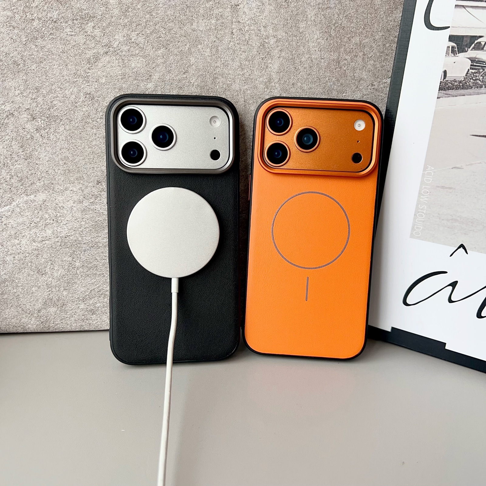 iPhone 17 Pro Leather-Wrapped Magnetic Case - Shockproof Hybrid Cover, Orange