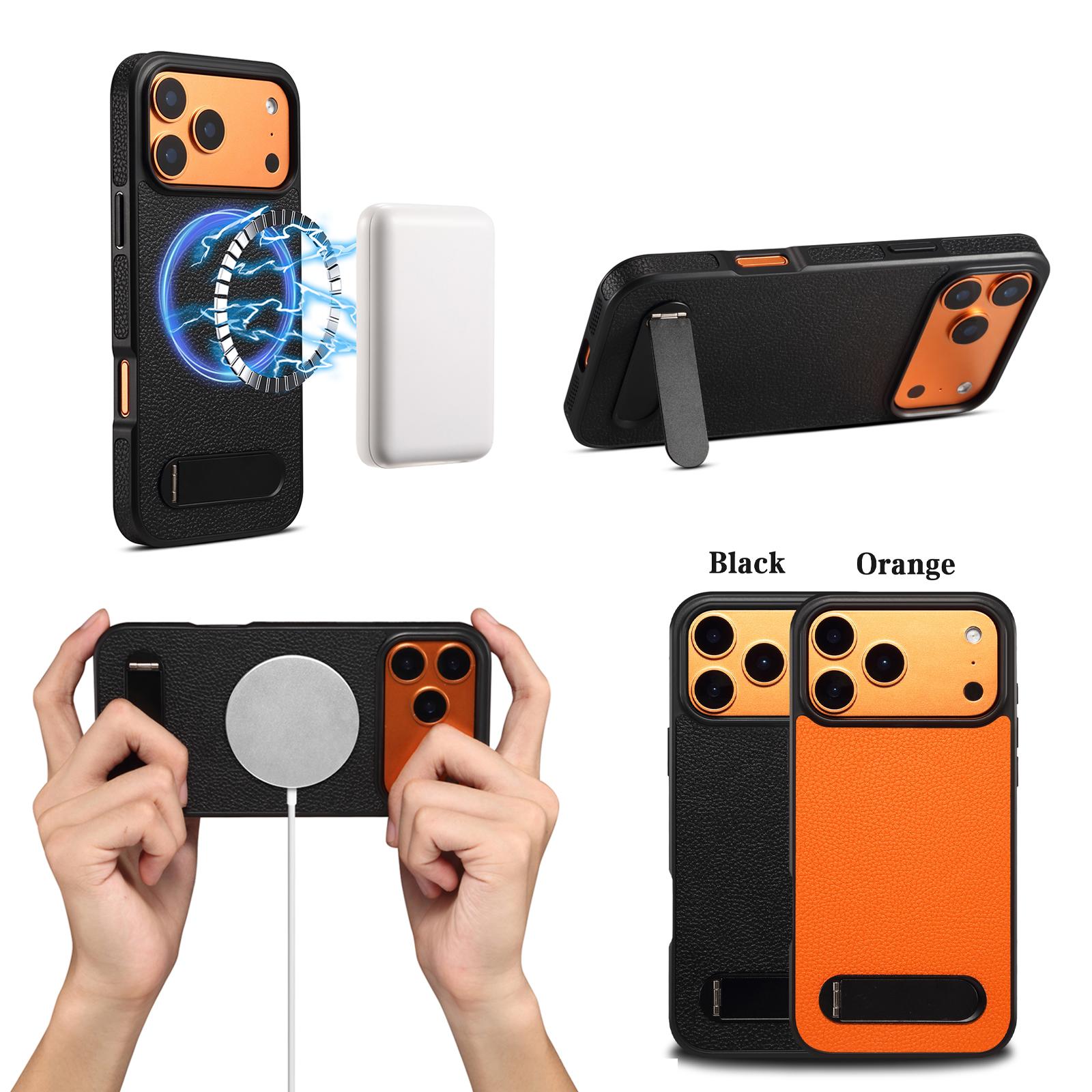 All pictures shown are for illustration purpose only. Actual product may vary due to product enhancement.Denior Lychee Texture Kickstand Phone Case for iPhone 17 Pro | PU Faux Leather | Wireless Charging Supported - Black