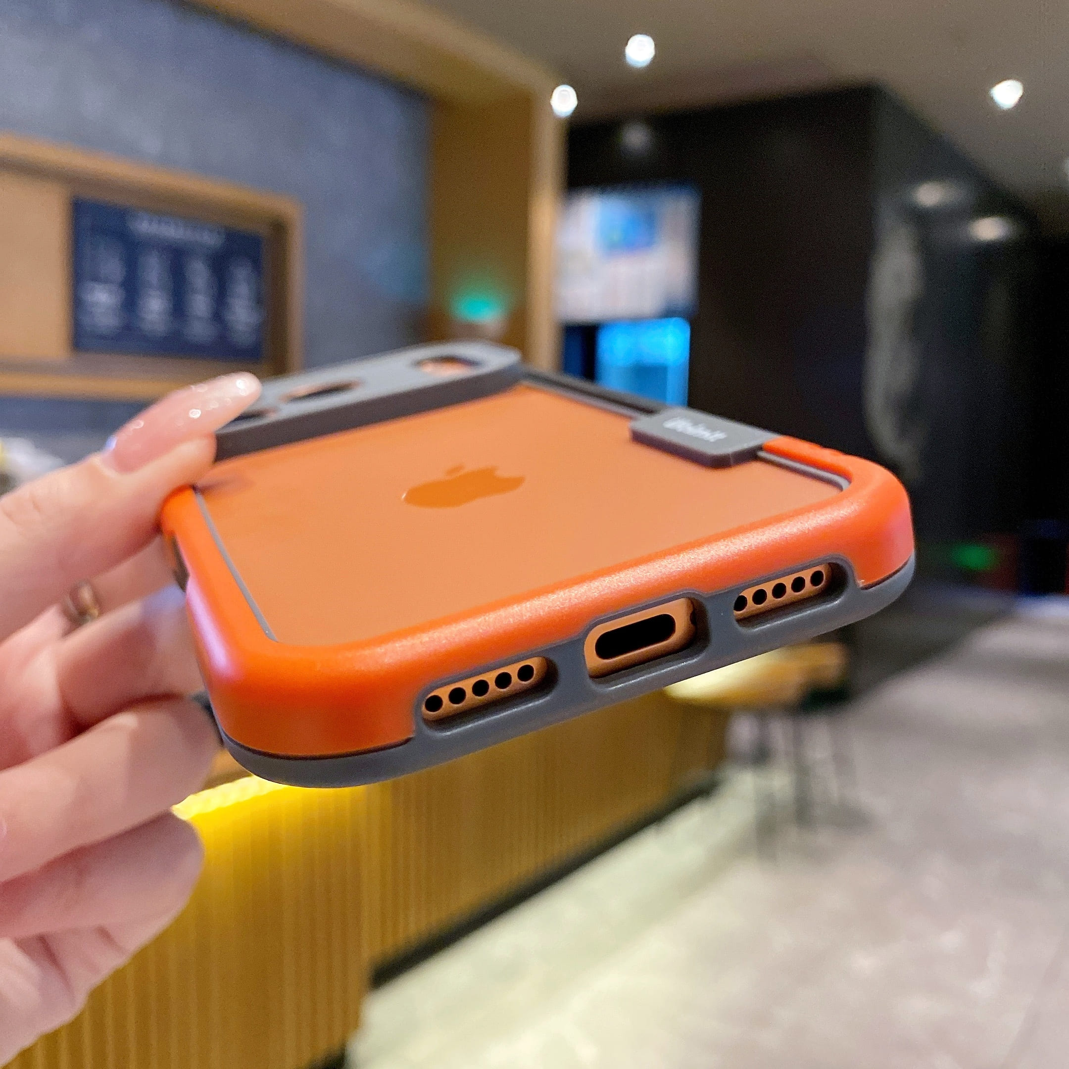 - Bicolor Frame Design: Black/Orange dual-tone frame with contrasting accents around camera and edges.