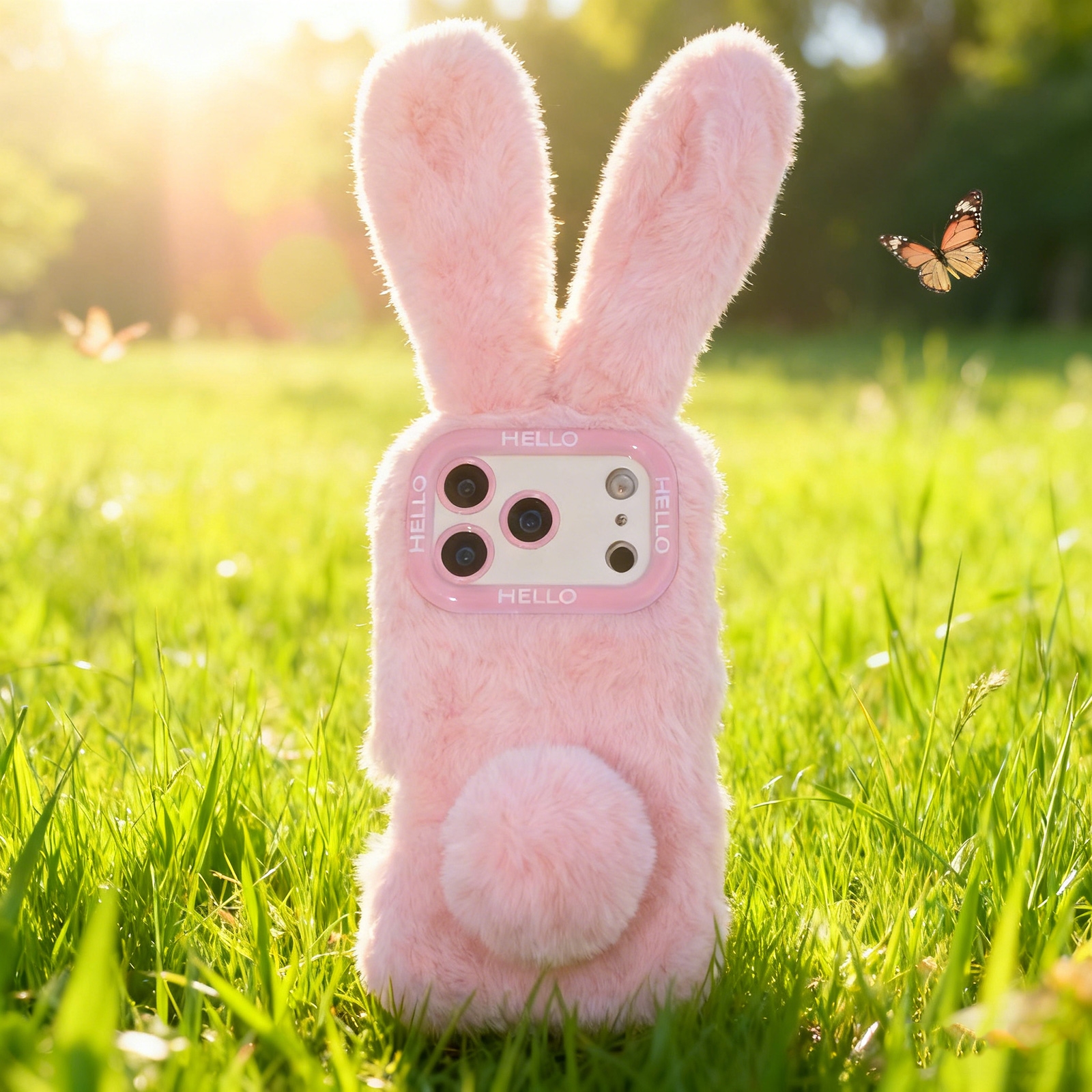 Pink Plush Silicone Bunny with Tail Phone Case for iPhone 17 Pro Max – Soft Furry Cute Protective Cover