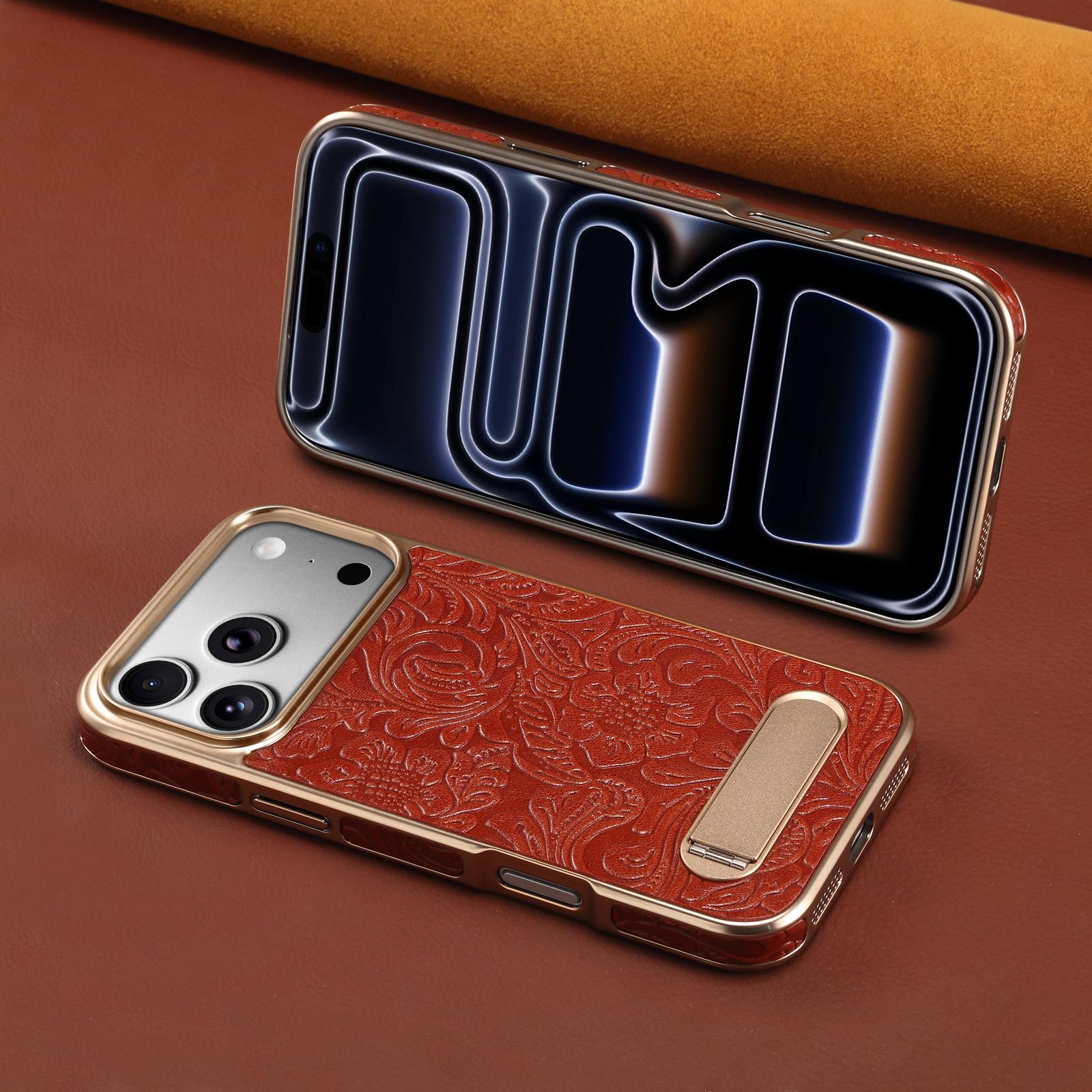 All pictures shown are for illustration purpose only. Actual product may vary due to product enhancement.Denior Retro Tang-style Flower Single-Stand Electroplated Phone Case for iPhone 17 Pro Max | Genuine Cowhide Leather | Wireless Charging Supported - Red