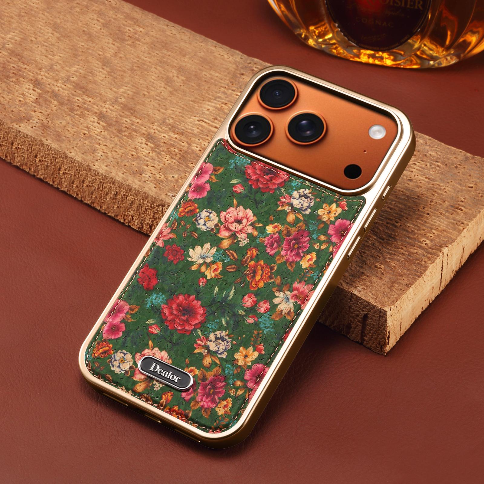 All pictures shown are for illustration purpose only. Actual product may vary due to product enhancement.Denior Printed Magnetic Detachable Electroplated Phone Case for iPhone 17 Pro | Cork Material | Wireless Charging Supported - Peony Green