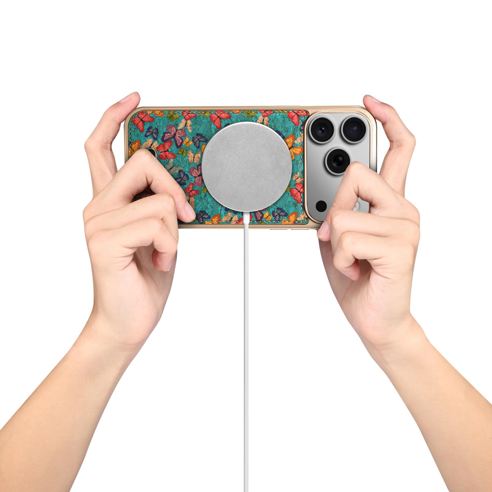 All pictures shown are for illustration purpose only. Actual product may vary due to product enhancement.Denior Printed Magnetic Detachable Electroplated Phone Case for iPhone 17 Pro | Cork Material | Wireless Charging Supported - Butterfly Blue