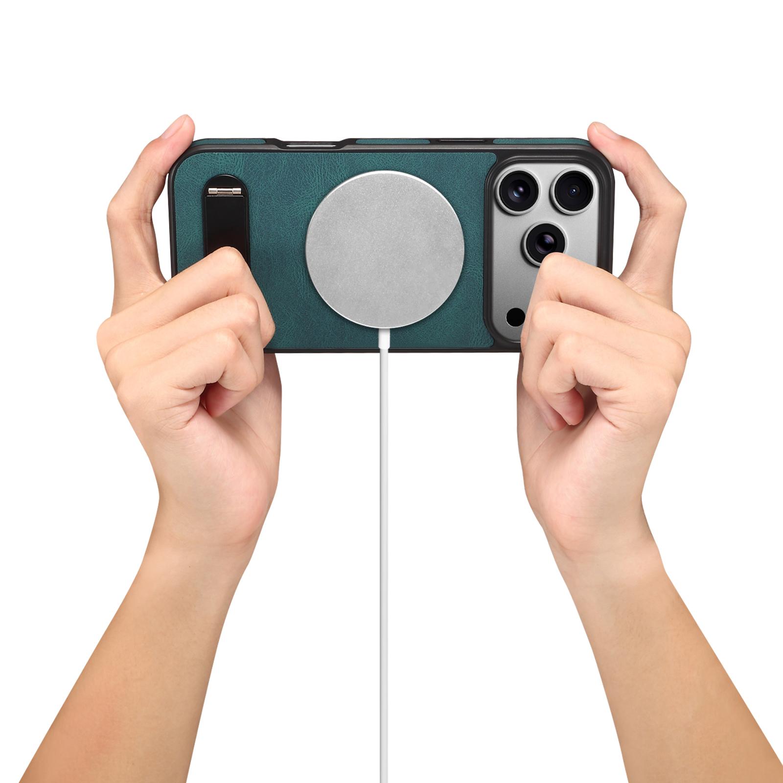 All pictures shown are for illustration purpose only. Actual product may vary due to product enhancement.Denior Skin-Feel Kickstand Phone Case for iPhone 17 Pro | PU Faux Leather | Wireless Charging Supported - Blue