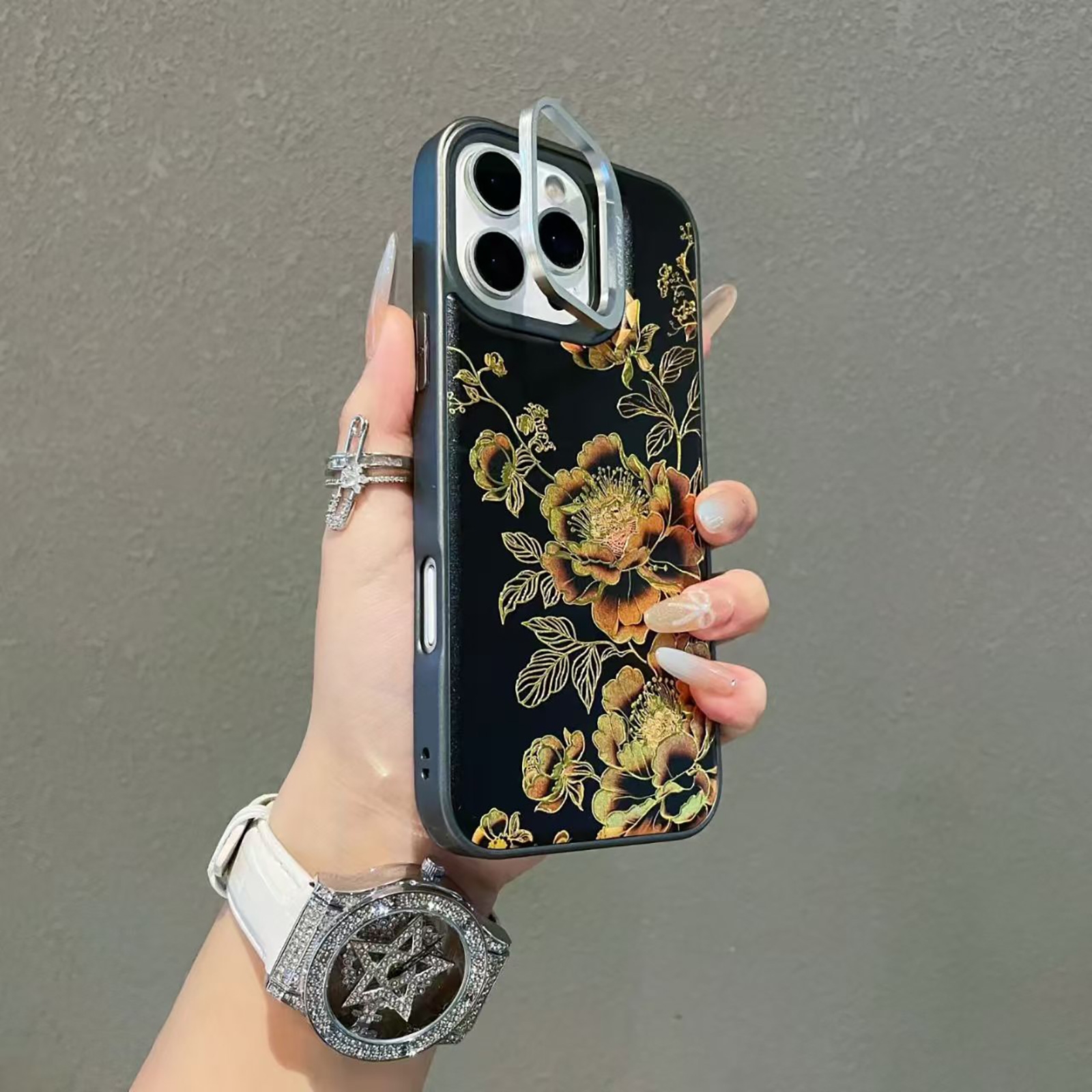 iPhone17 Pro Max Black Background Gilded Peony Magnetic Case, Gold