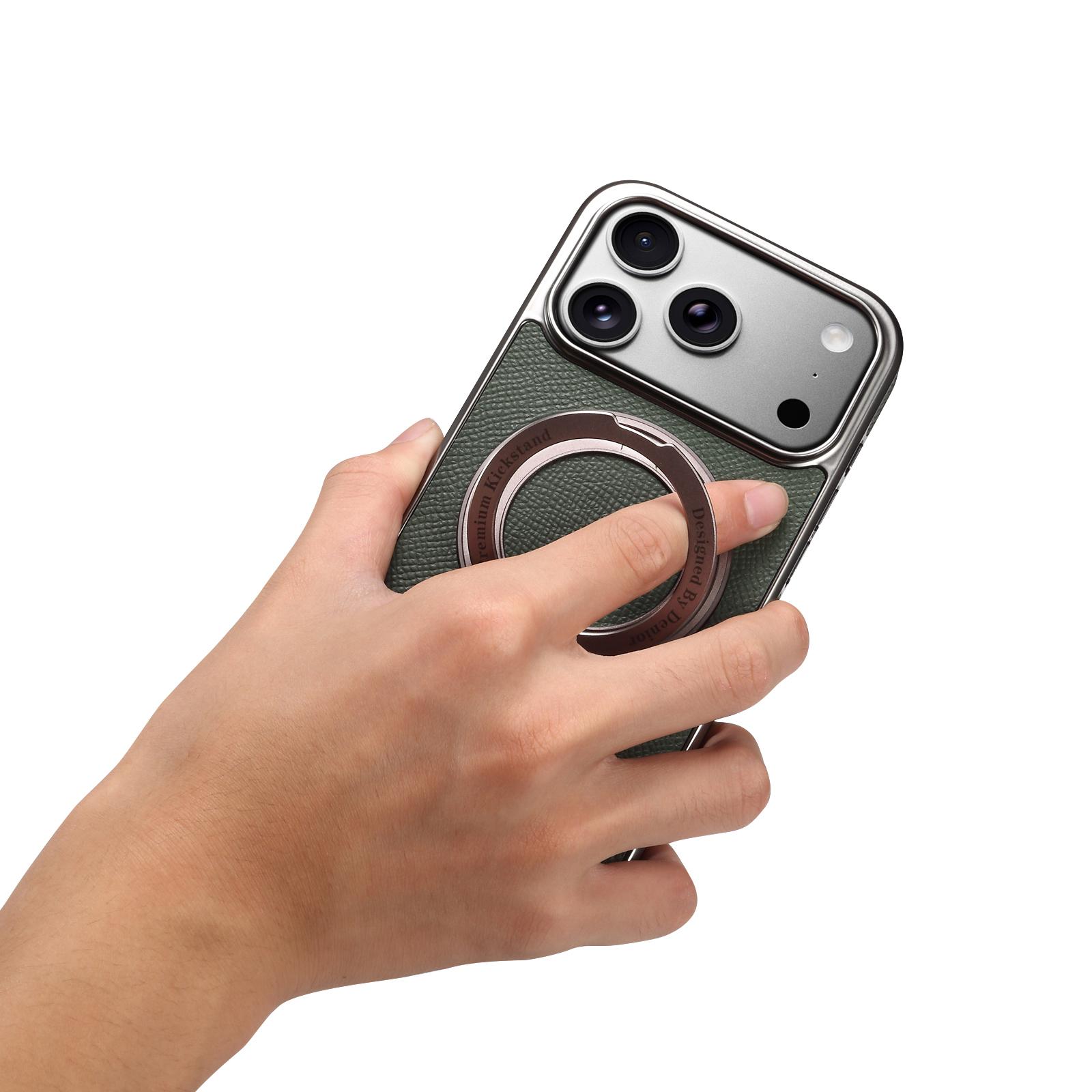 Denior Magnetic Gear Rotating Stand Phone Case for iPhone 17 Pro | Genuine Cowhide Leather | Fingerprint-Resistant Electroplated Case - Green