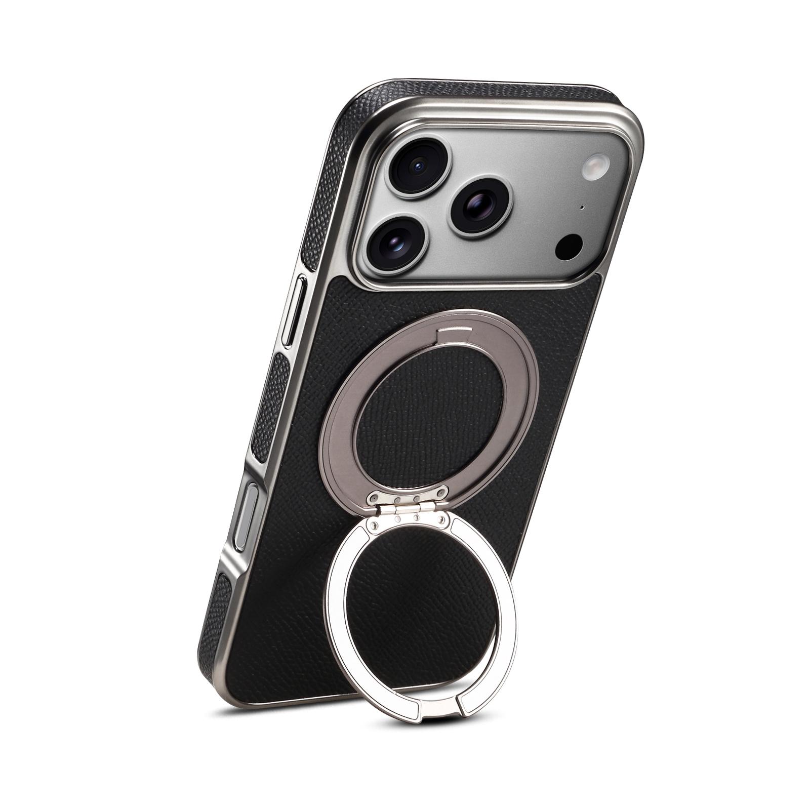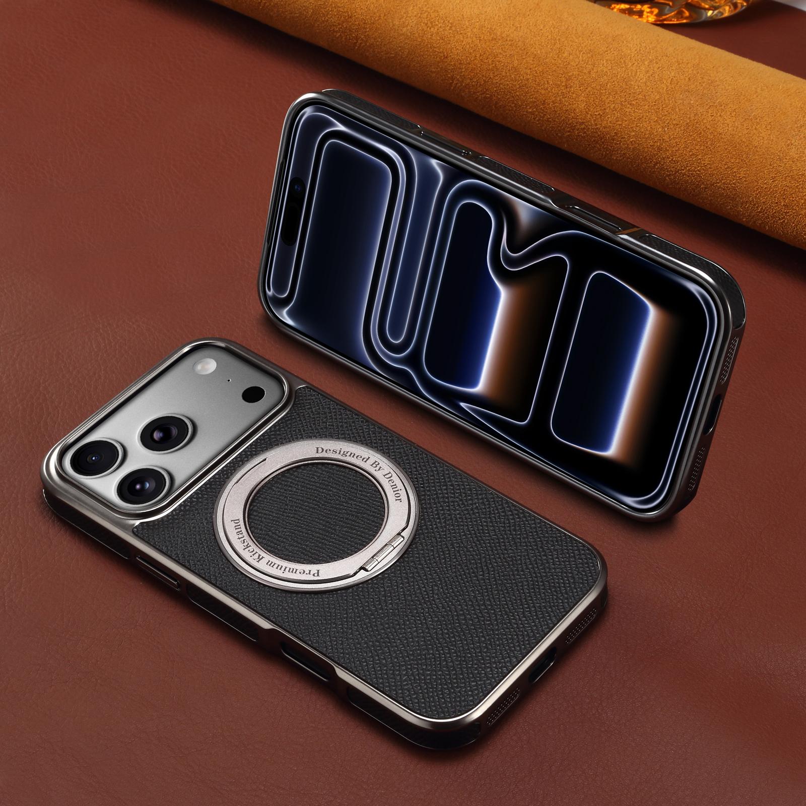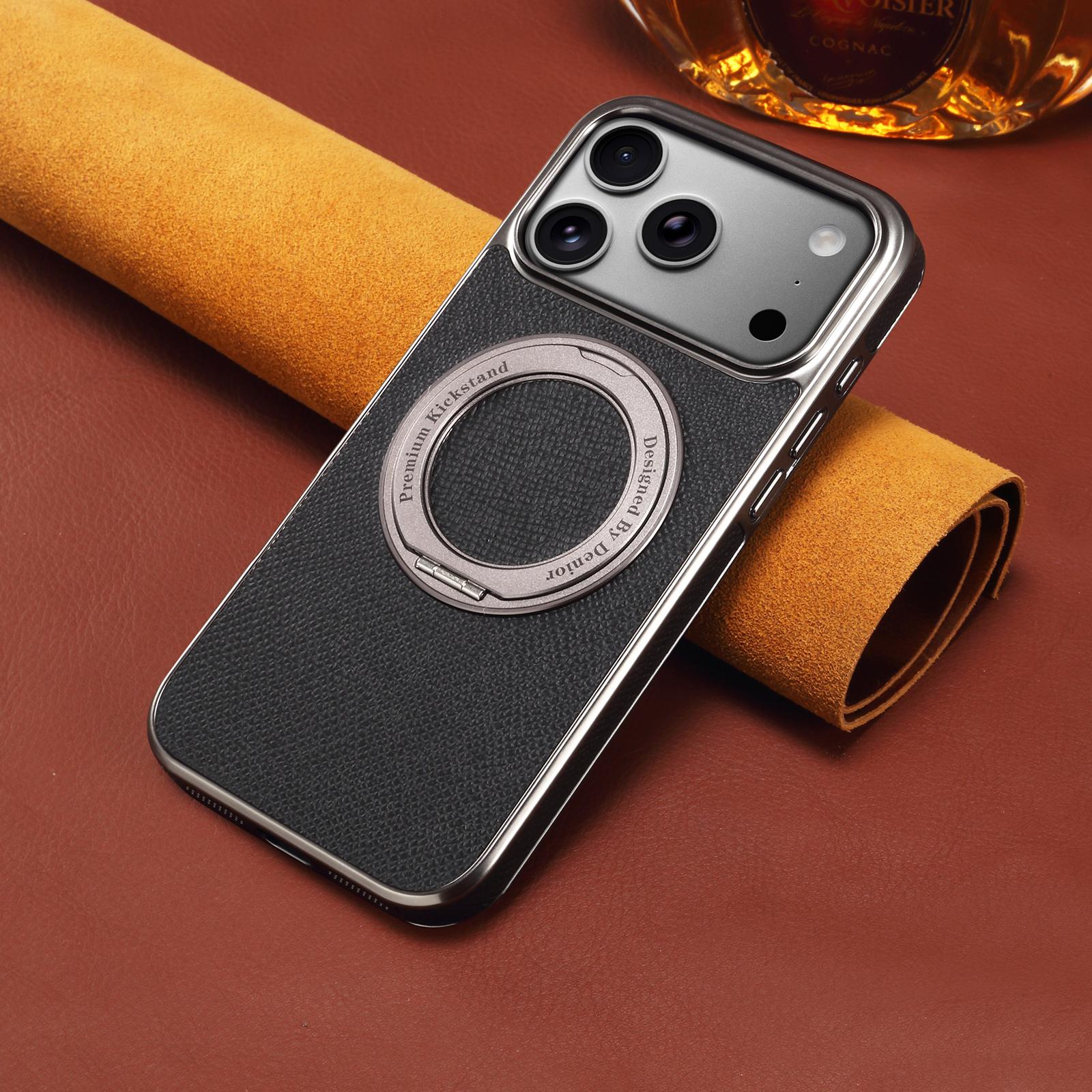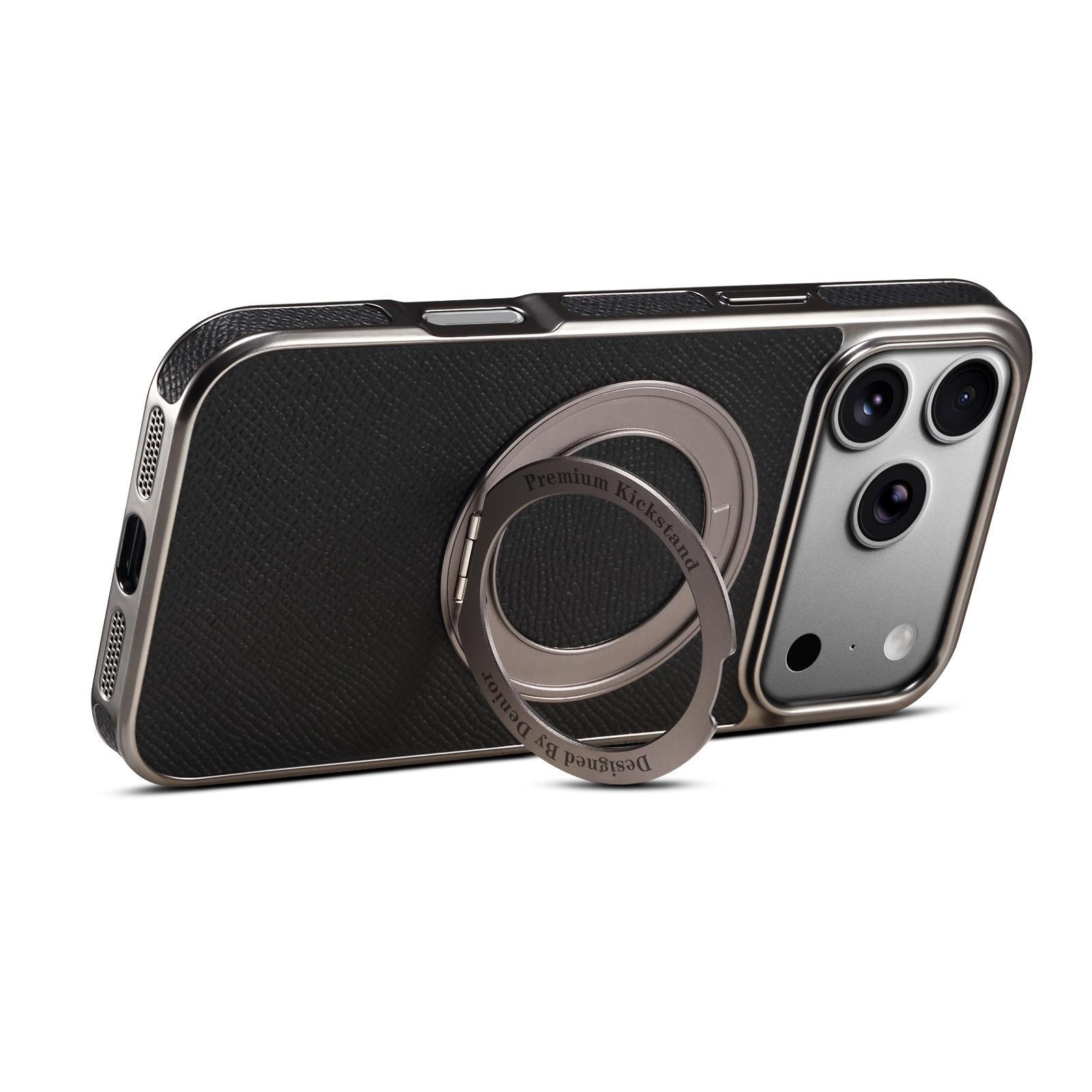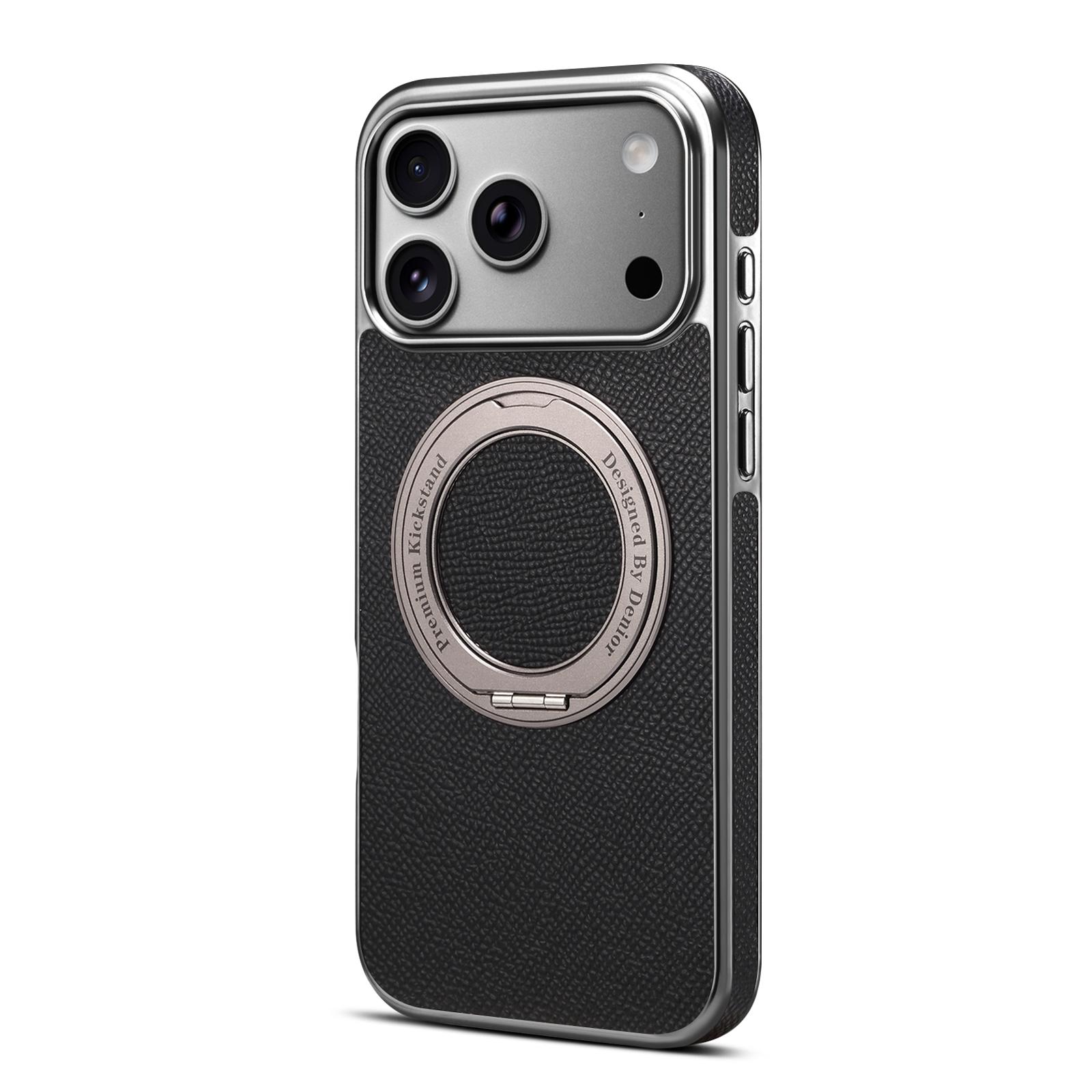 Denior Magnetic Gear Rotating Stand Phone Case for iPhone 17 Pro Max | Genuine Cowhide Leather | Fingerprint-Resistant Electroplated Case - Black