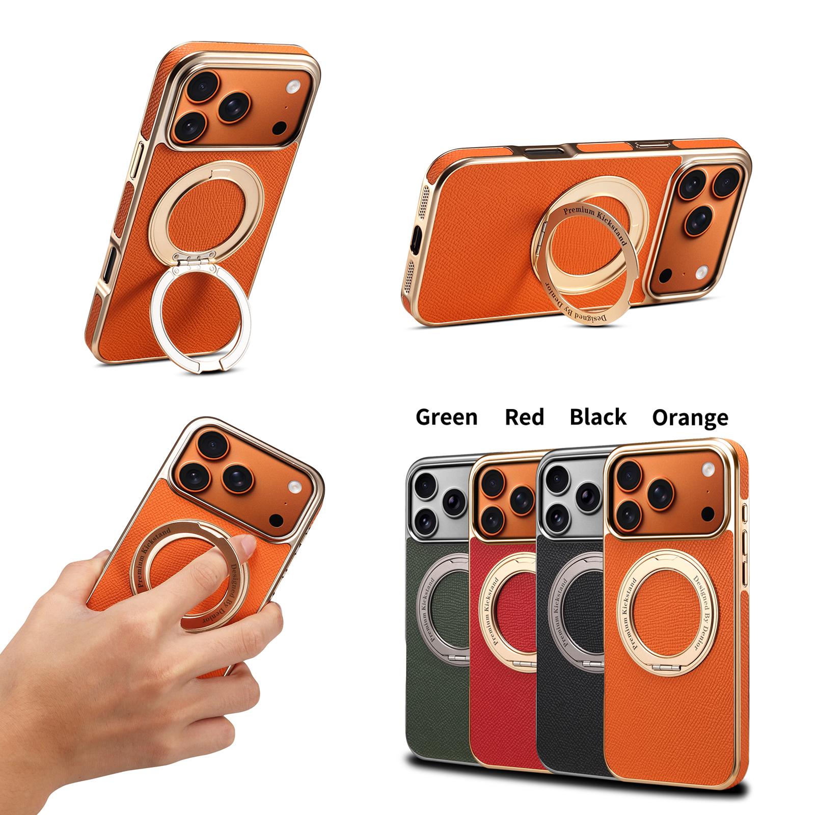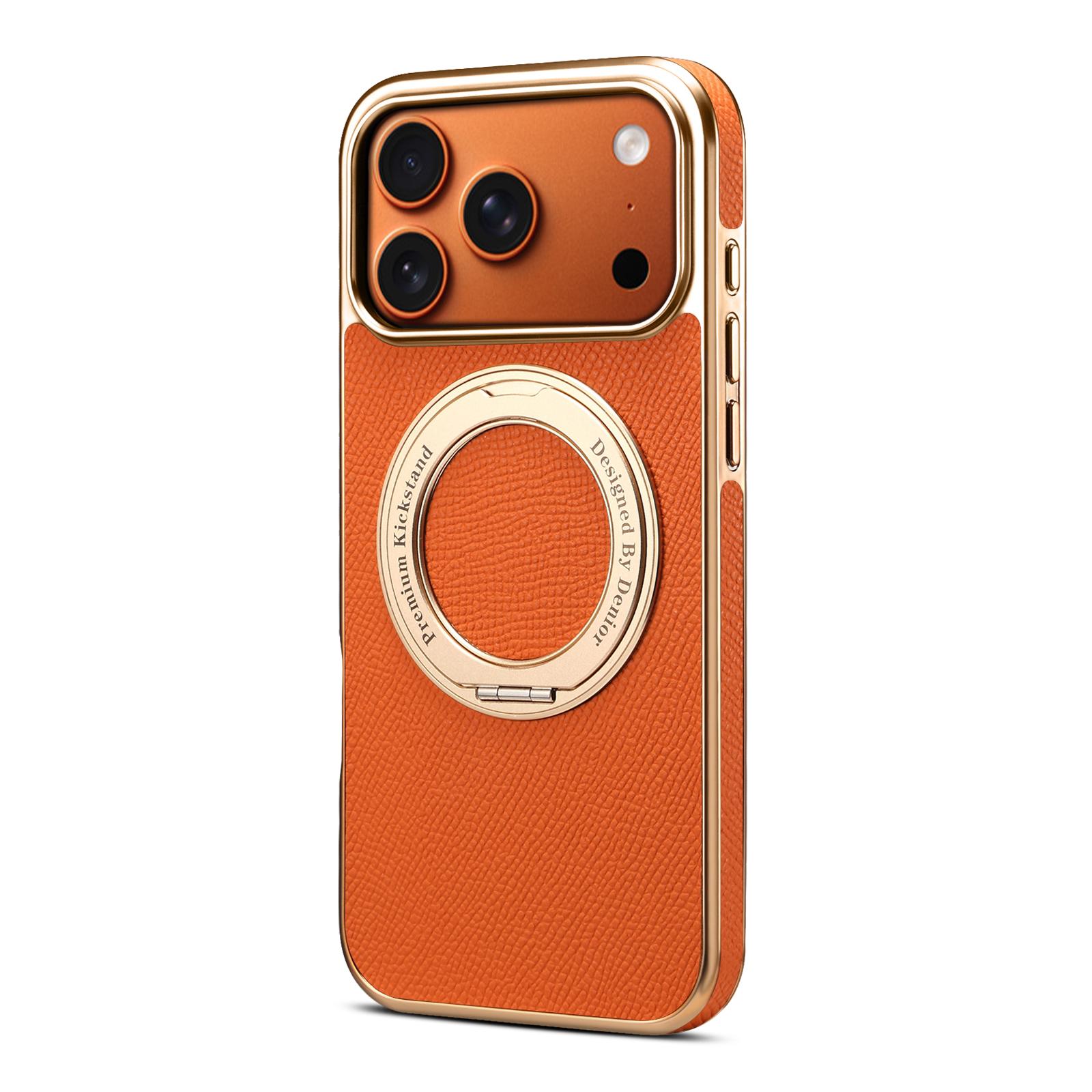 Denior Magnetic Gear Rotating Stand Phone Case for iPhone 17 Pro Max | Genuine Cowhide Leather | Fingerprint-Resistant Electroplated Case - Orange