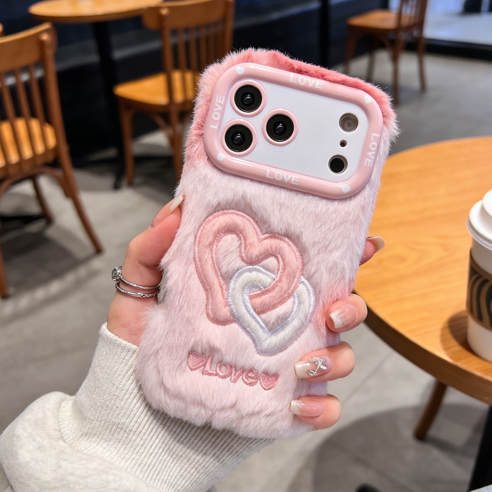 Pink Plush Silicone Double Heart Phone Case for iPhone 17 Pro – Soft Furry Cute Protective Cover