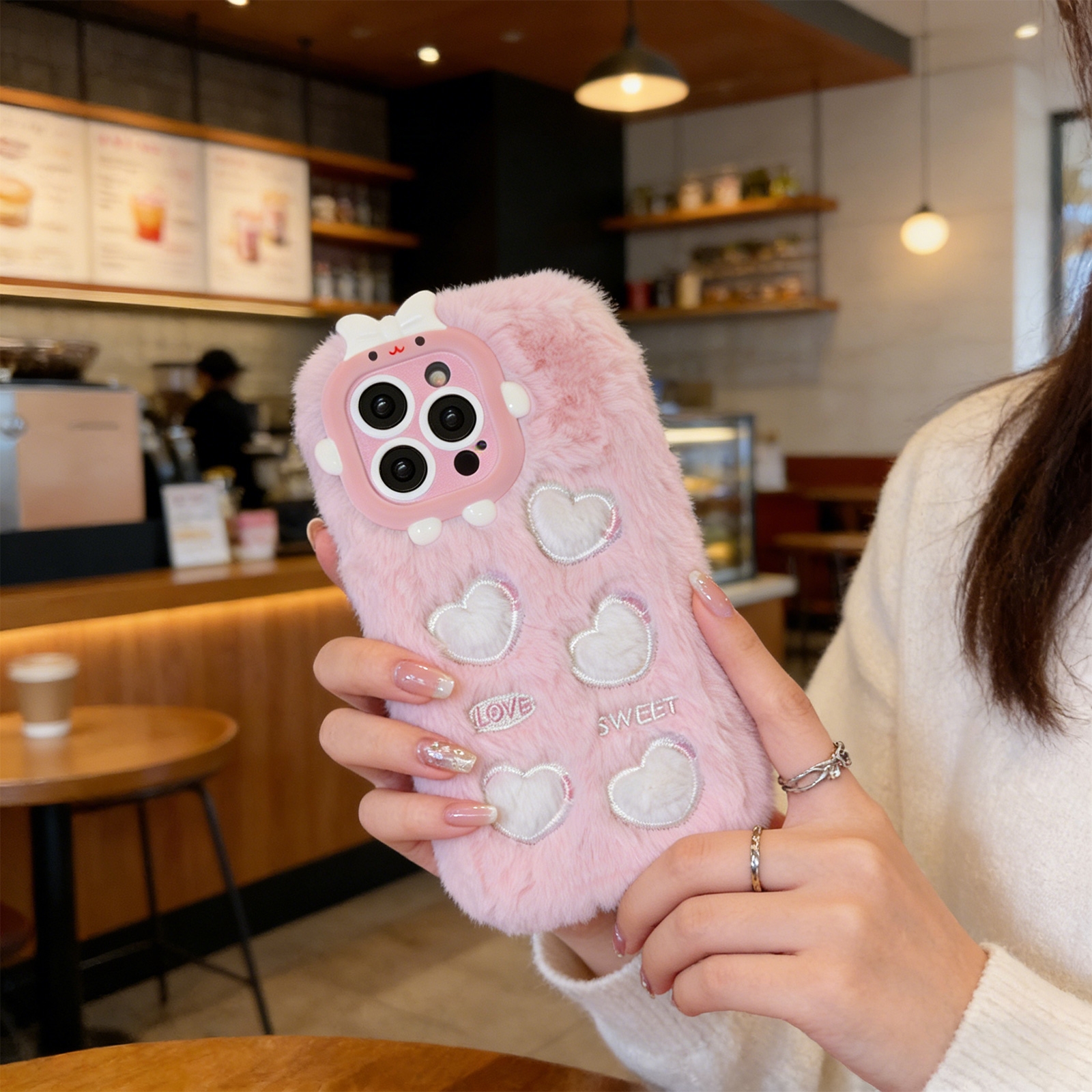 Pink Plush Silicone Phone Case with Five Hearts for iPhone 16 Pro – Soft Furry Cute Protective Cover