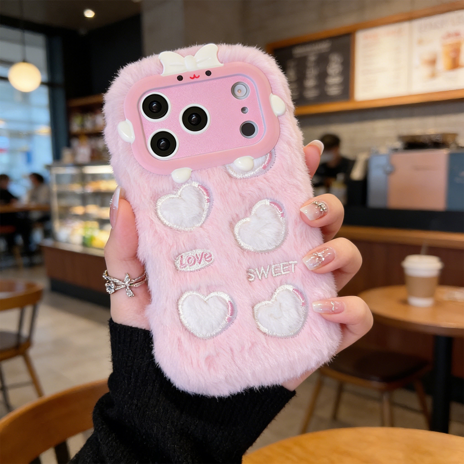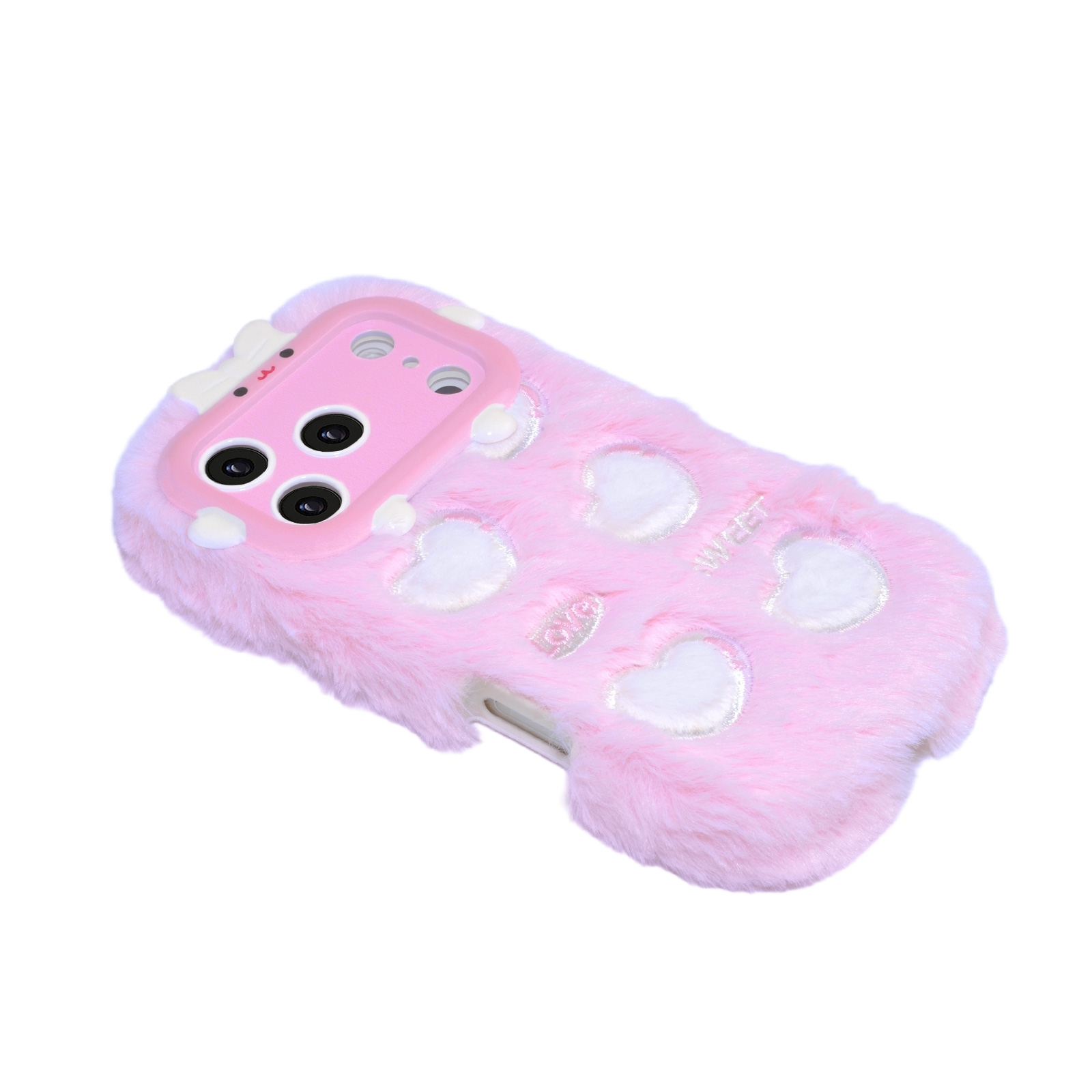 Pink Plush Silicone Phone Case with Five Hearts for iPhone 17 Pro Max – Soft Furry Cute Protective Cover