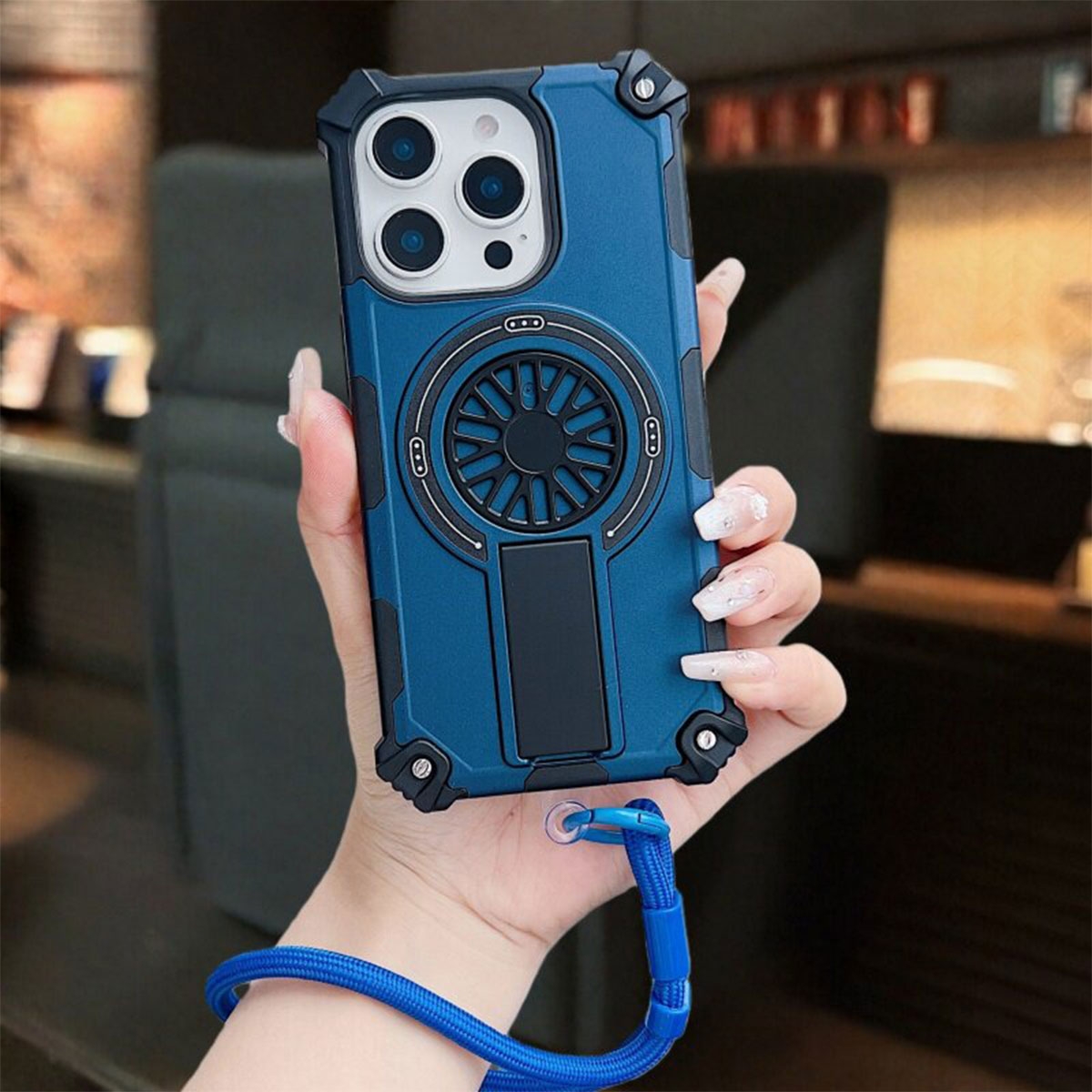 Rugged Magnetic Case with Foldable Kickstand & Wrist Strap for iPhone 17 Pro Max, Blue