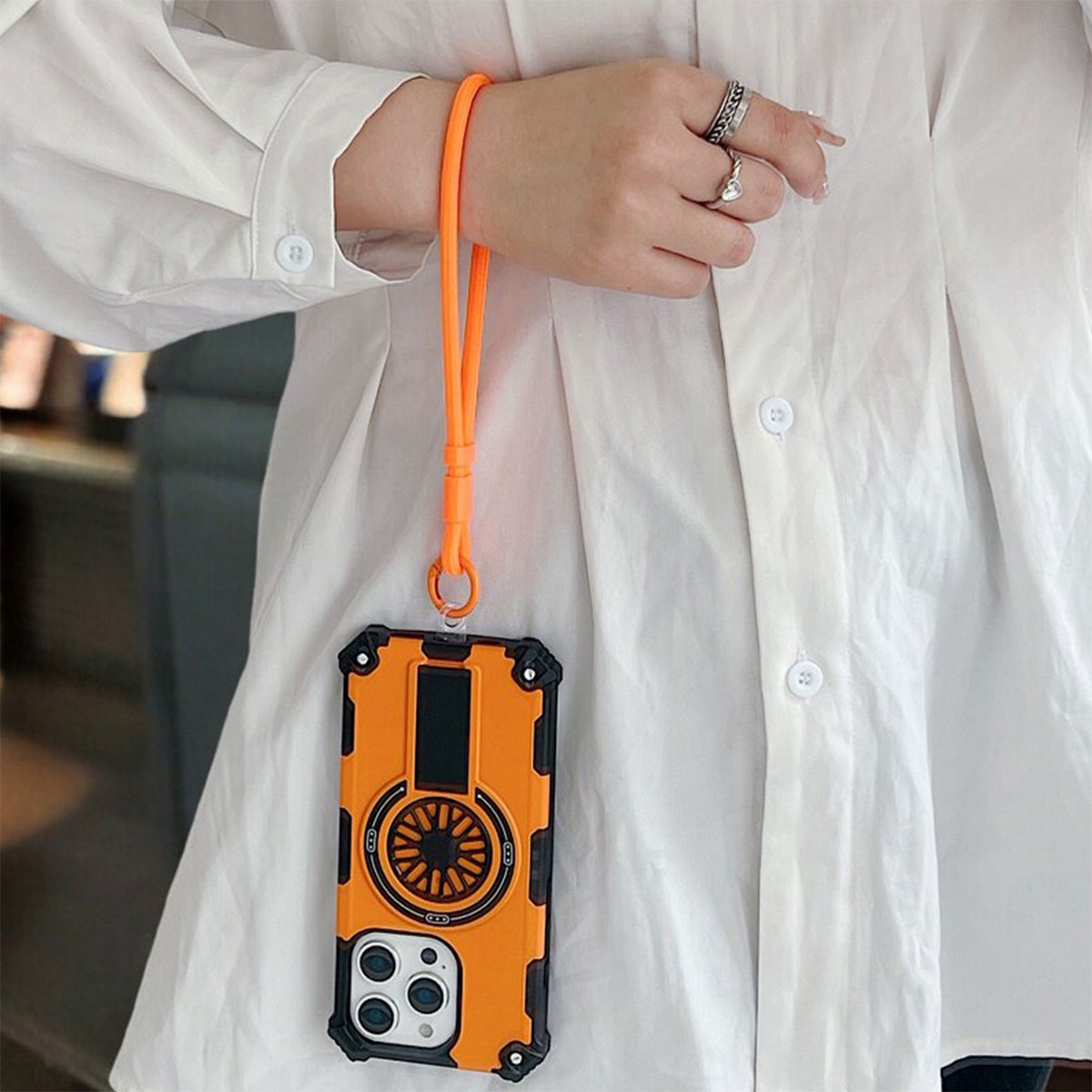 Rugged Magnetic Case with Foldable Kickstand & Wrist Strap for iPhone 17 Pro Max, Orange