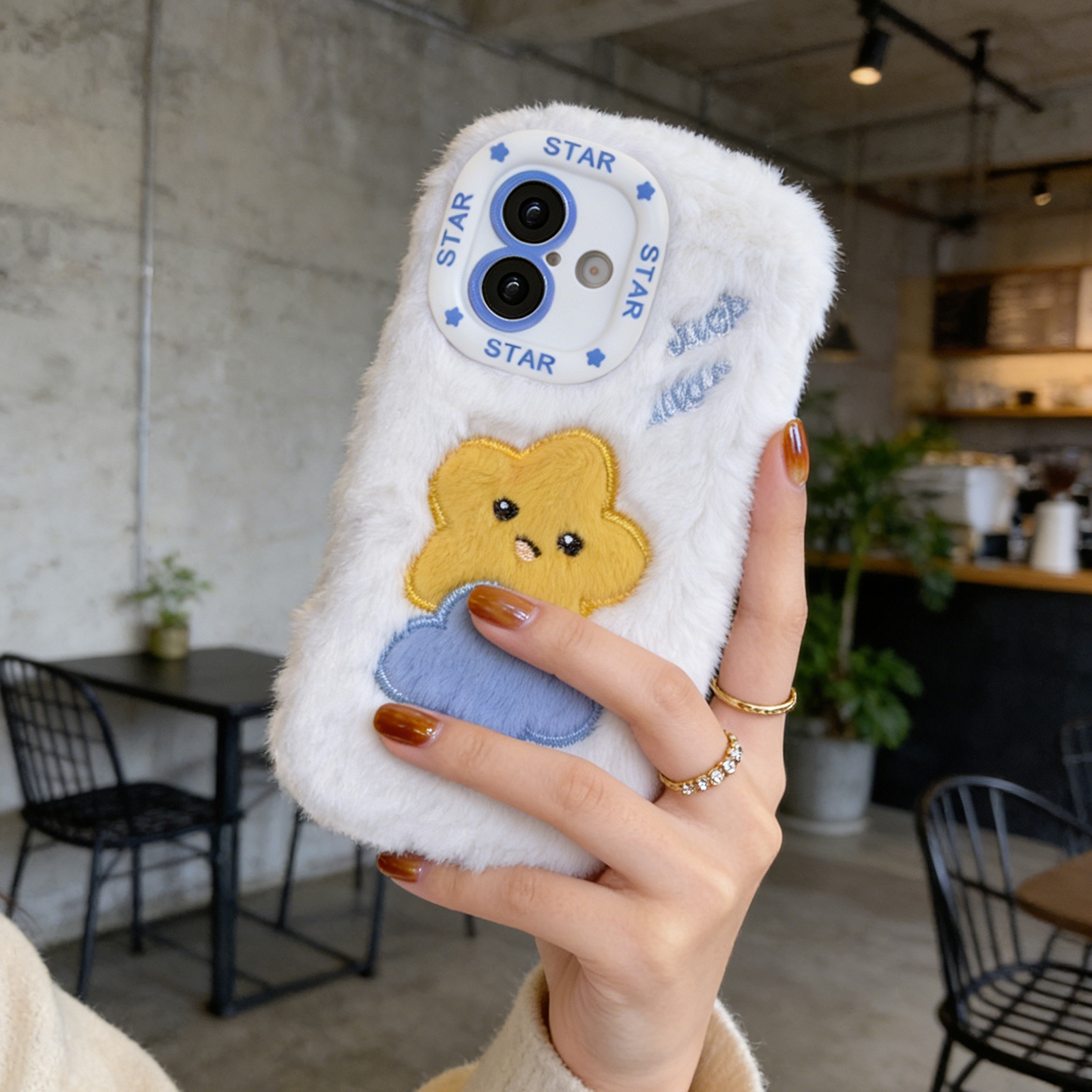 White Cloud Star Plush Silicone Phone Case for iPhone 16 – Soft Cute Protective Cover